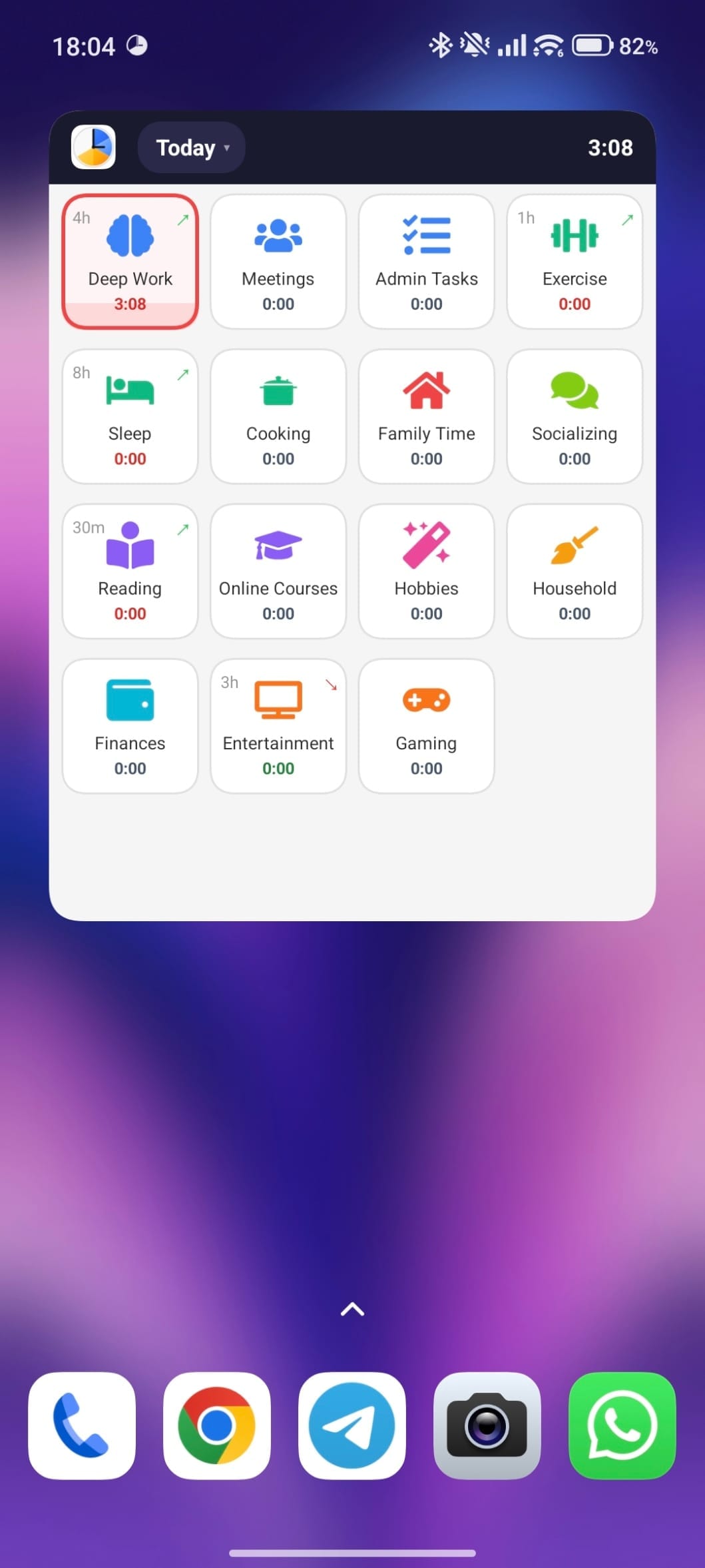 Organize activities into areas like Work, Health, Family, and Hobbies. Understand how you balance different parts of your life.