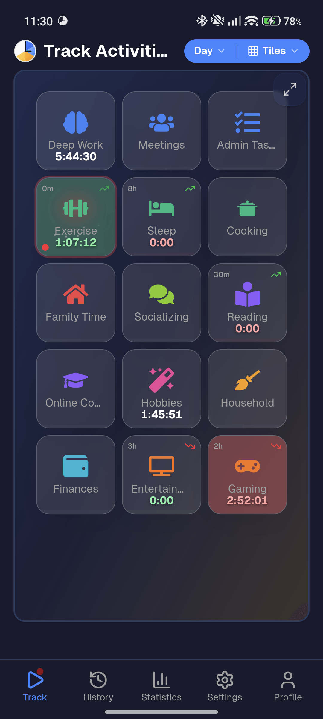 That's what Timetracker is designed for. Unlike most time trackers that focus on billable hours, Timetracker covers your entire day — work, sleep, exercise, hobbies, family time, and everything in between.