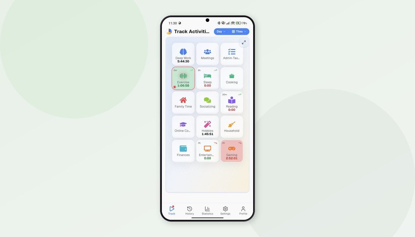 Stop setting vague goals like 'exercise more.' Set minimum, maximum, and exact time goals with daily, weekly, and custom schedules. Free time tracking app.