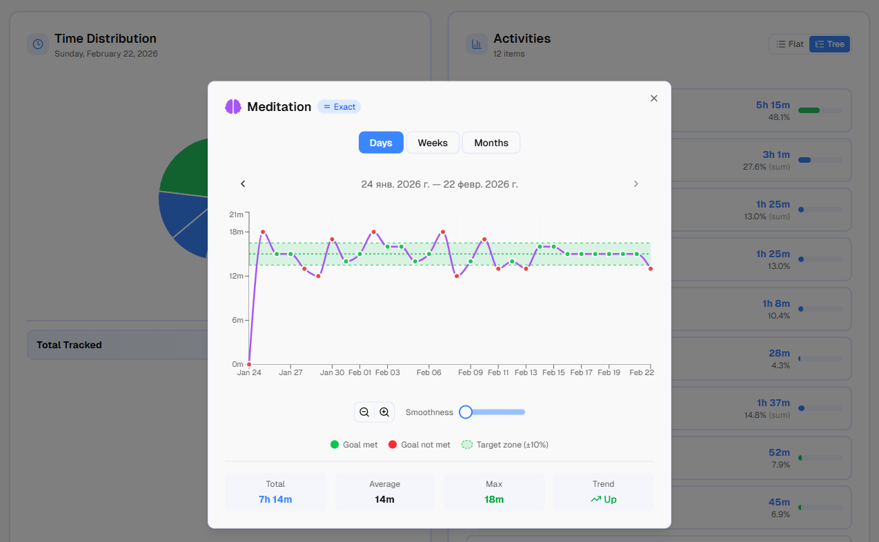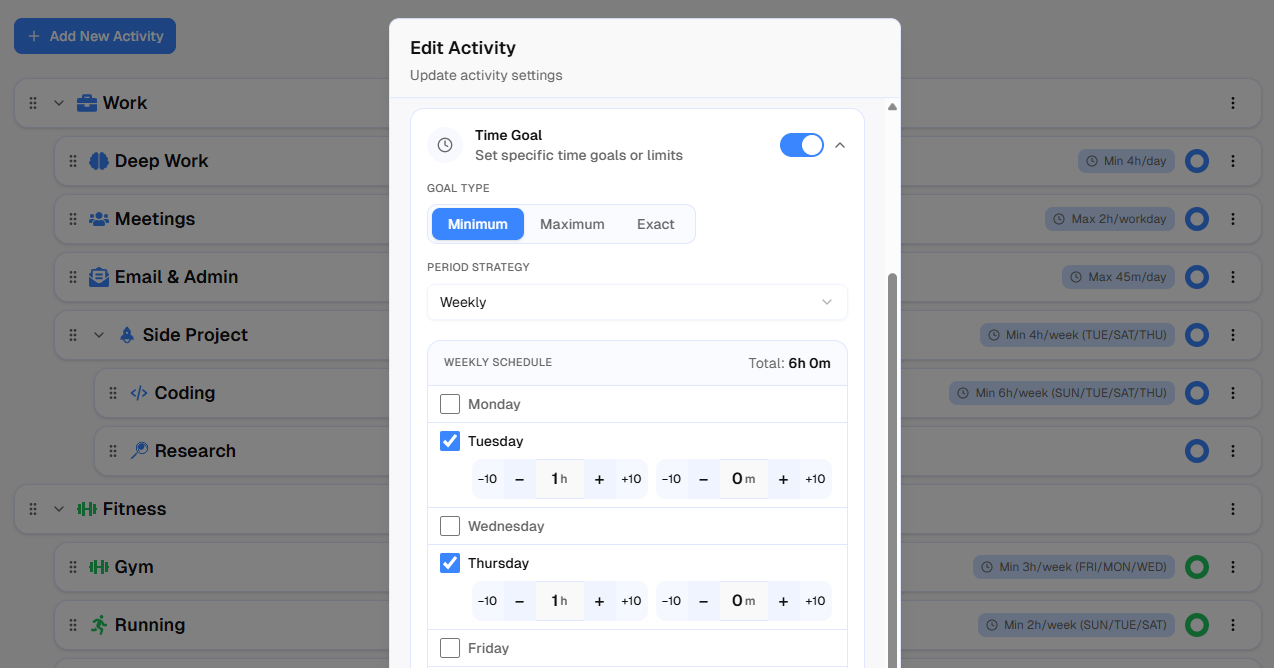 Most time trackers give you one option: a flat daily goal. In timetracker.live, you choose from daily, workday, weekend, weekly, or monthly — and for weekly and monthly, you customize the target for each individual day. Setting it up takes about 30 seconds per activity.