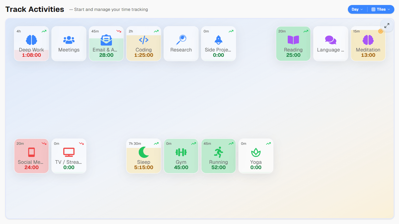Here's what a real setup in timetracker.live looks like for someone balancing work, health, and personal growth. You can organize all of these as nested activities to organize your tracking into a clean hierarchy: