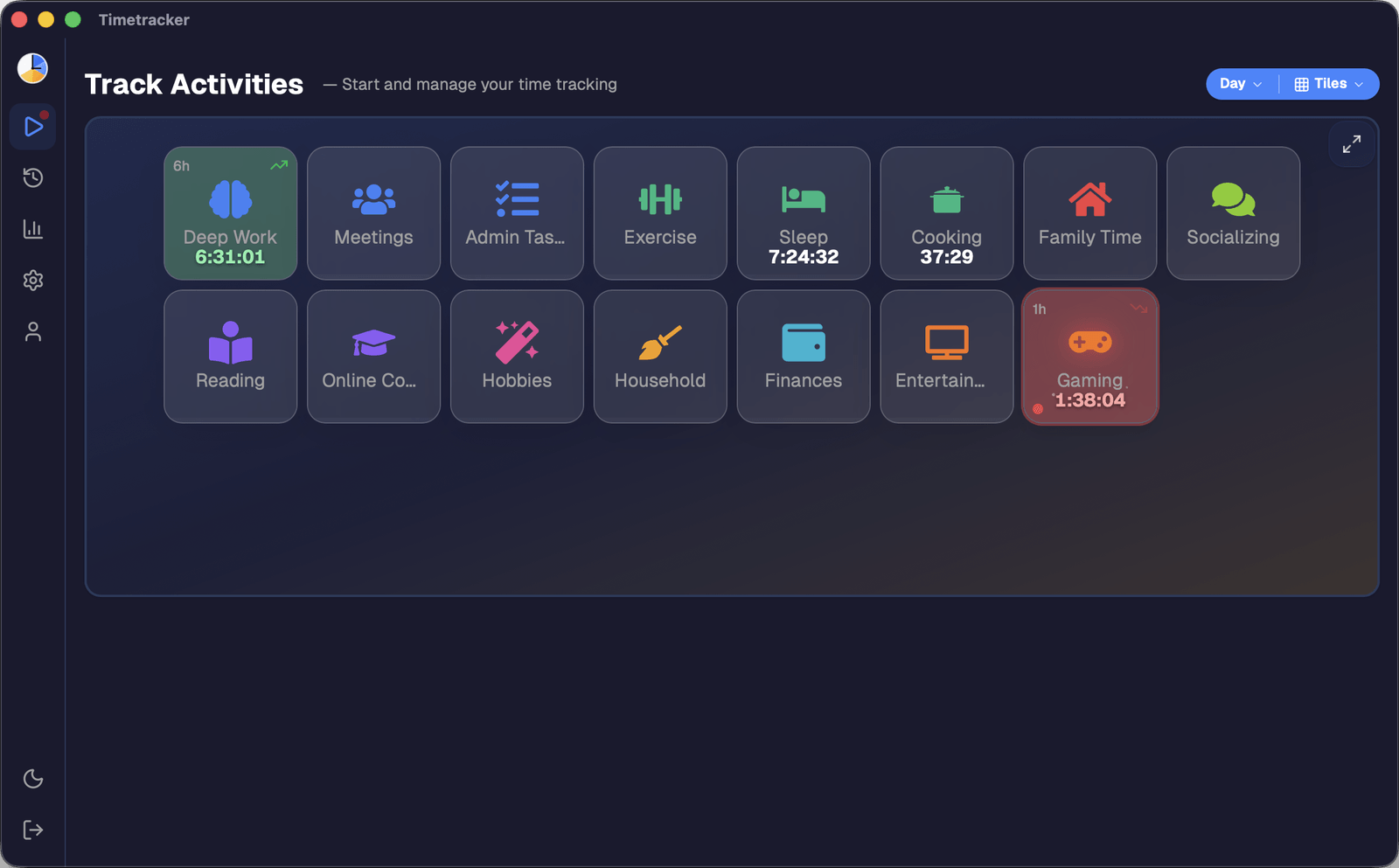A native desktop time tracking app for macOS. Track all 24 hours of your day — work, health, hobbies, and family. No ads, no limits, completely free.