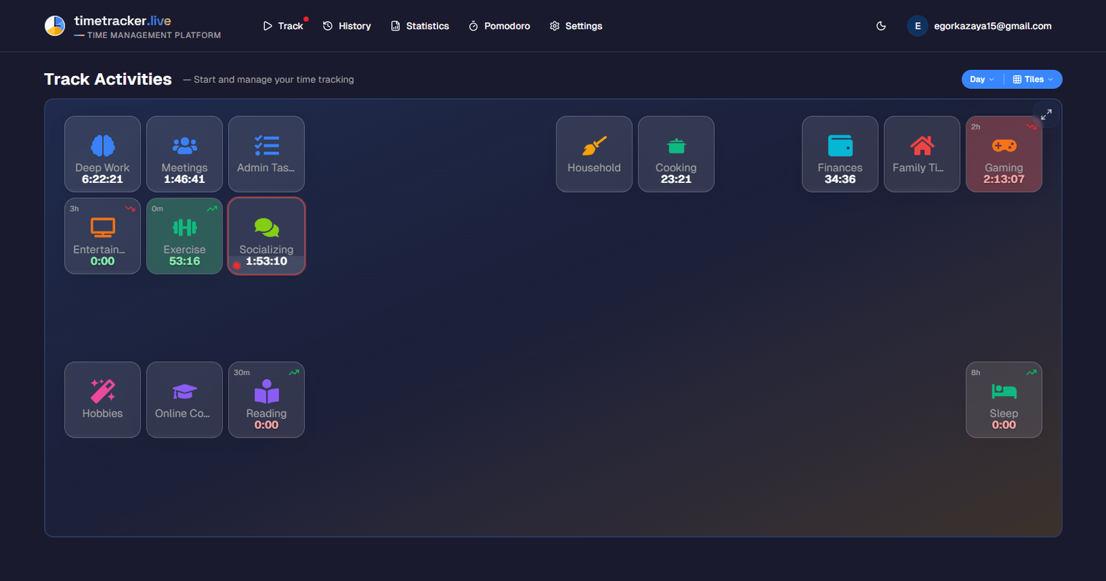 Timetracker.live is a free online time tracking app that runs entirely in your browser — no download or install required. Sign up with an email or Google account and start tracking your time across life areas like work, study, sleep, and exercise. Everything syncs across devices automatically.
