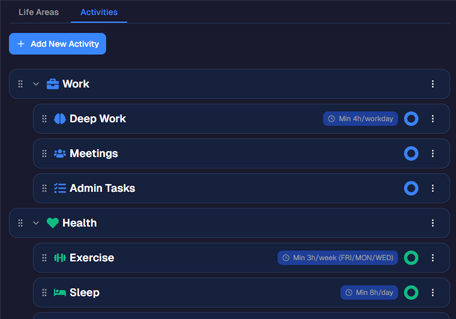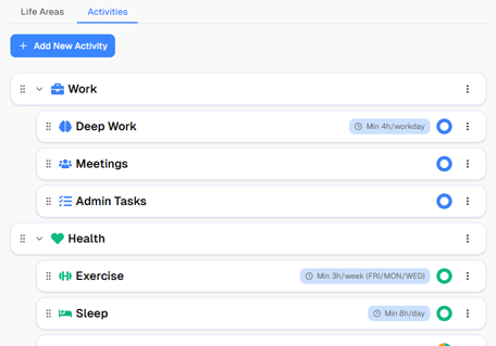 Add 5–7 life areas: Work, Health, Sleep, Hobbies, Family. Then add a few activities under each. Done in under two minutes.