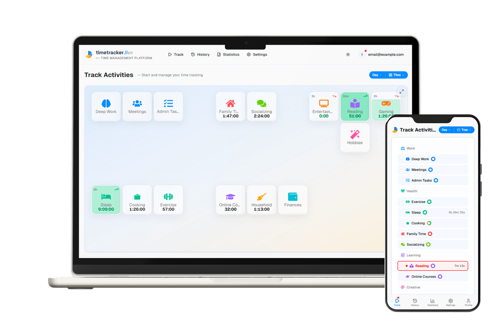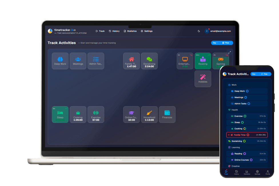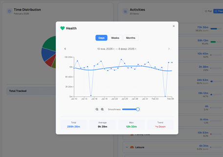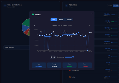 Timetracker is different. It's built for personal time awareness — understanding how you split your day between work, health, sleep, hobbies, and family. No billing. No bloat. Just simple tracking.