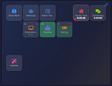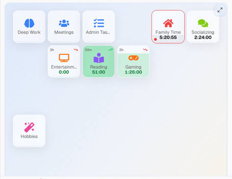 Organize your time into areas like Work, Health, Family, and Hobbies. No clients, invoices, or billable rates cluttering your view.
